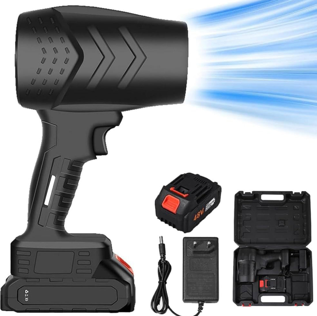 * Hard Case: A durable plastic carrying case is included, which is useful for storing and transporting the blower, battery, and charger, keeping them organized and protected.